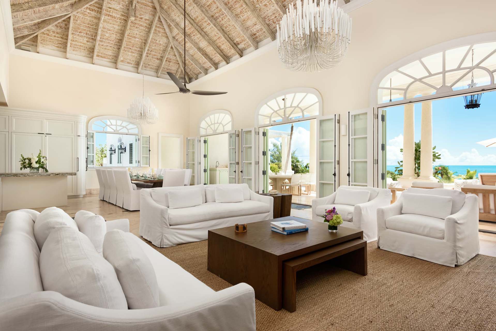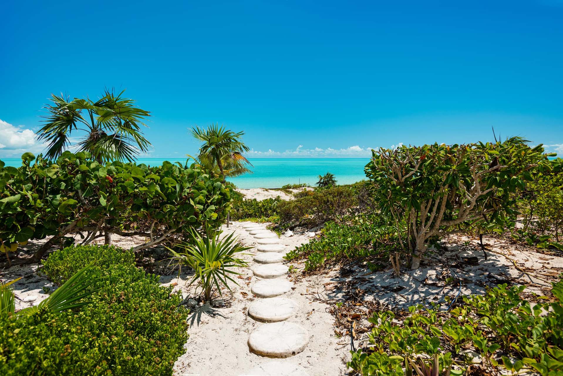 This stunning villa, designed by renowned architect Rafael Amuchastegui, is nestled amidst pristine natural surroundings, just steps from sparkling sands and endless ocean views, on the edge of Long Bay Beach, recognized by Condé Nast magazine as one of the best in the world. The villa occupies over two acres of serene landscaping, yet is conveniently located near the center of Grace Bay, just a 10-minute drive away.
